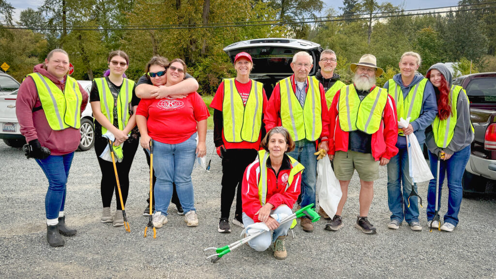September 27, 2025 – One way our club is giving back to the community – In cooperation with the City, we clean litter and debris four times a year along Grade Road. On a beautiful Saturday morning we met across from the fire station and cleaned the shoulders of Grade Road from Hartford Drive to Highway 92. Many thanks to the City of Lake Stevens Parks and Recreation Department for providing the equipment necessary. And lest we forget, thanks to our volunteers pictured above, from left to right: Tosha Edwards, Jackie Fox, Billy Fox, Kathy Fox, Nicole. Perez, Sarah Jennings, Mike Radovich, Gary Jennings, Darwin Smith, Sarah Tallman & Natalie Tallman.