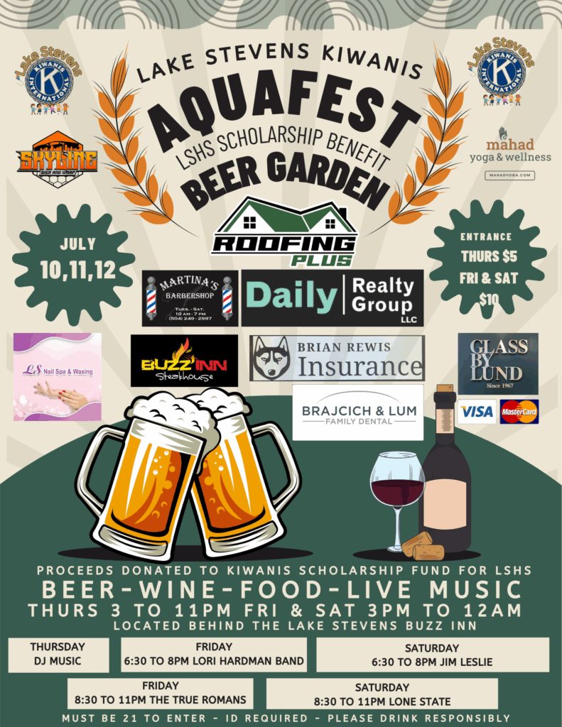 The 2025 Lake Stevens Kiwanis Beer Garden is coming soon. Three nights of beer, wine, awesome food and great music. Located behind the Lake Stevens Buzz Inn, the event will be open July 10, 11 & 12. Hours will be 3-11 am on Thursday the 10th and 3pm – 12am on Friday & Saturday. Entrance fee will be $5 on Thursday and $10 on Friday & Saturday. Proceeds benefit the Kiwanis Foundation for scholarships to Lake Stevens High School graduates. Cash and credit cards accepted. Hope to see you there! Must be 21 & have valid ID to enter!